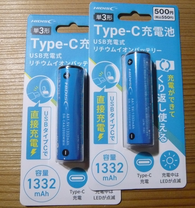 記事にしました→ダイソー Type-C充電池 USB充電式リチウムイオンバッテリー 単三を試す・・・入荷中!