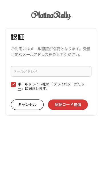 同意してログインすると、メール認証画面になります。小生がインストール時は、ここで難問でした。ポールドライト社のプライバシーポリシーですが、タップしても空白でした。表示されるようになってからよく読んで同意できれば認証しましょう。(推奨しませんが、承認コード送信へ進む際は、自己責任でお願い致します・・・説明を読むと、メール認証しなくとも使えるようです)