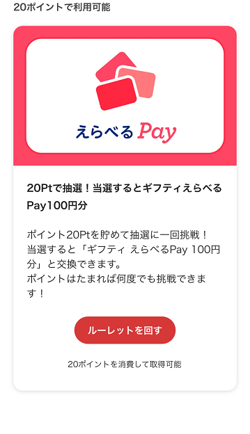 スワイプすると、ポイントが必要なキャンペーンの完歩証の引換や応募の案内、それと、えらべるPayのルーレット画面になります。