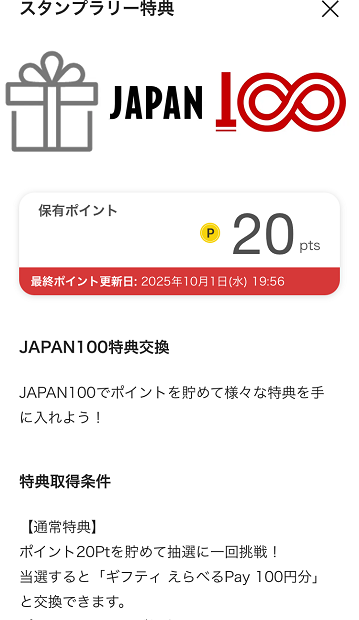 スタンプ履歴やポイントの確認などは、やっぱり、左側のJAPAN100をタップします。