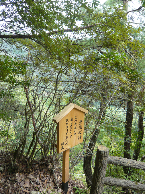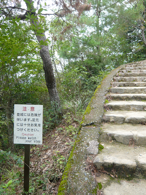登城はここから800mほど徒歩で登山します。ちょっとしたハイキングコースで、スカート不可のガイドブックもありますが、スカートの方も登られています(どちらかと言うと城の中の梯子階段を登りますので、スカートはやめた方が無難)。泥道や石道を登りますので、靴の底に溝があった靴じゃないとちょっと危ないです(パンプスで登られてる方もいましたが・・・ヒールは危ない)。