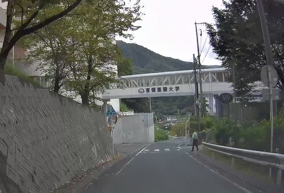 トンネルを出て、右に曲がるのが定番らしいです。また、細い道に戻るのも何なので、直進して吉備国際大学の方へ進みます。