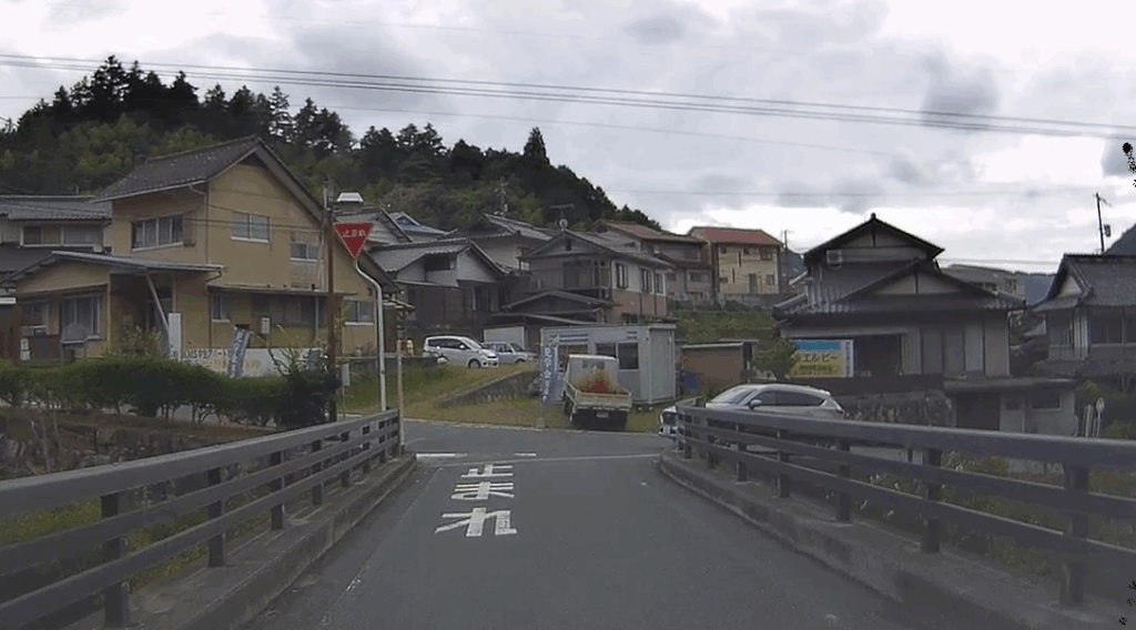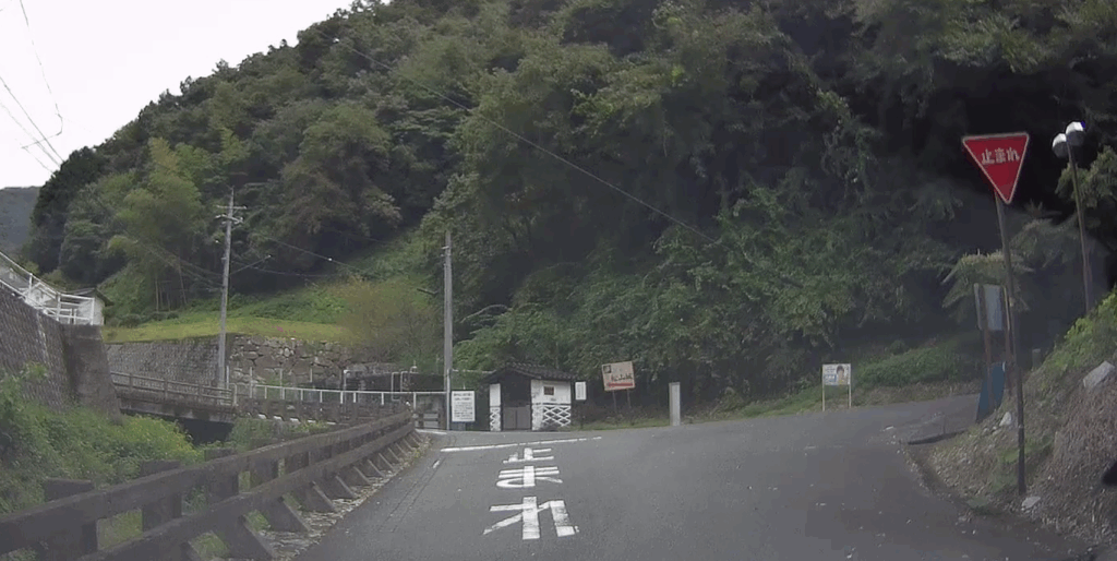 踏切です。まっすぐ行くこともできますが(すぐ一方通行で進むことが出来なくなります)、左側の踏切を渡ることをお勧めします(手前の止まれを左折し、川を渡ってすぐ右折)。左側の踏切を渡れば前方に国道180/313号が見えます。お疲れさまでした。