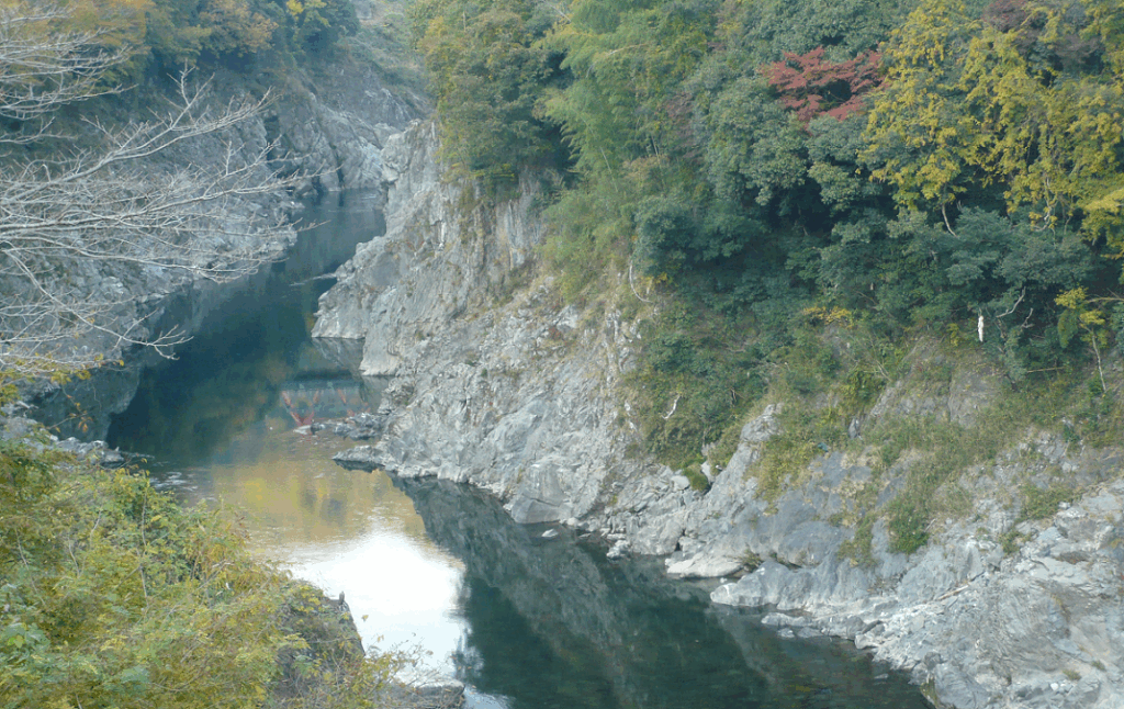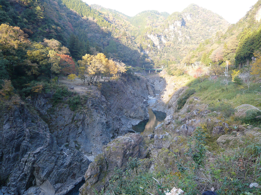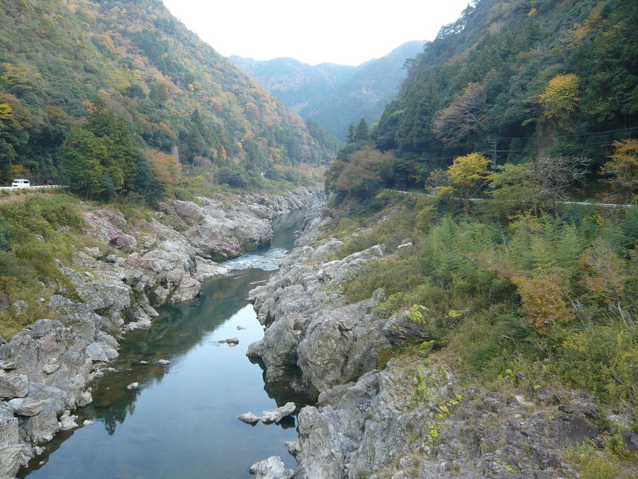 飛水峡(ひすいきょう)は、岐阜県加茂郡七宗町、一部八百津町、もしかすると白川町にもかかってるかもしれませんが、飛騨川(木曽川の支流)の峡谷です。見事なV字谷で、その左岸の中段を国道41号が走っています。道の駅「ロックガーデンひちそう」では公園になっていてじっくり眺められます。また国道41号も、ところどころ、駐車帯やチェーン用の駐車場がありますので、車を止めて眺めることが出来ます。