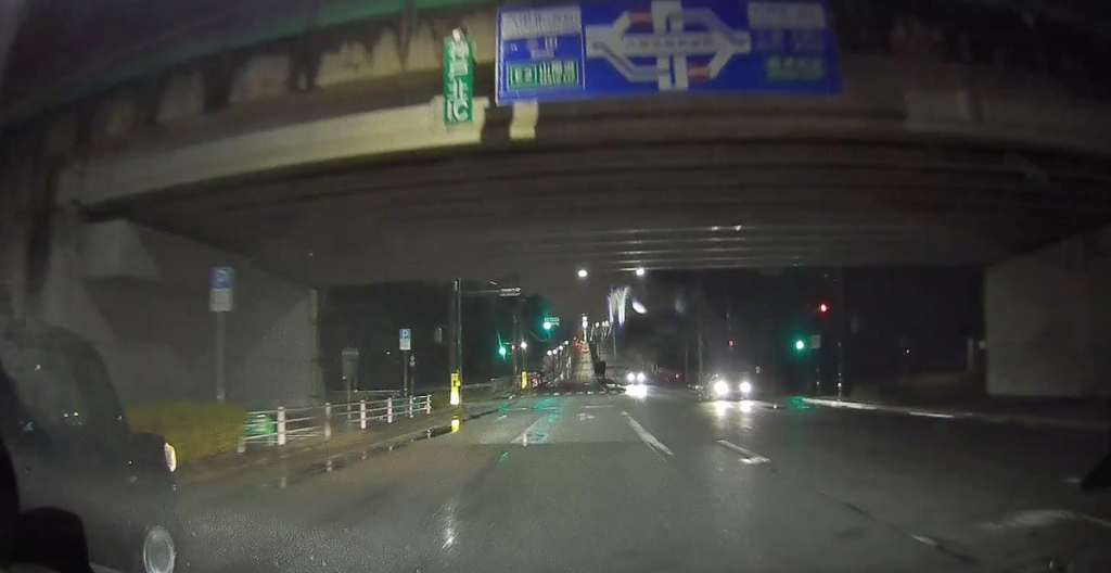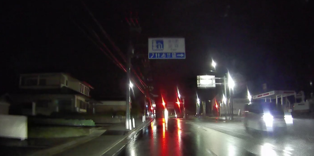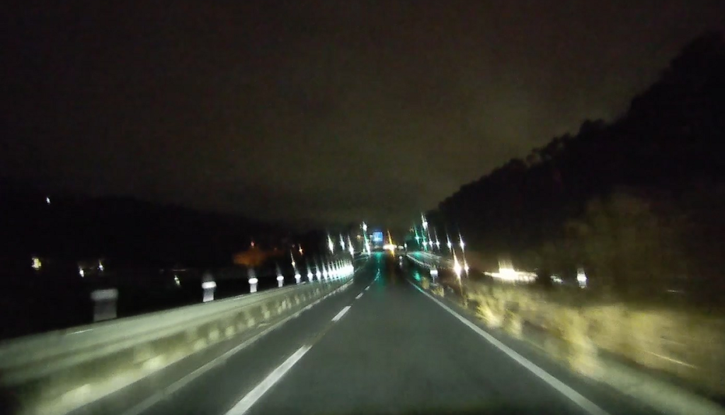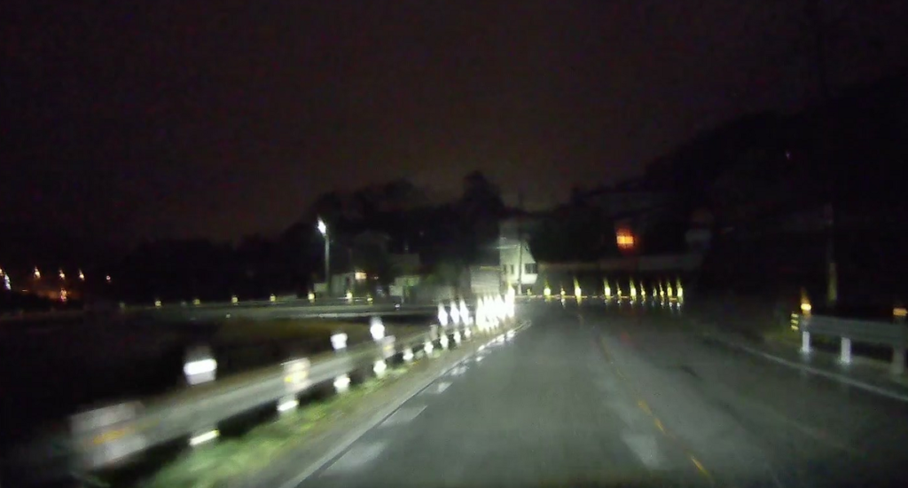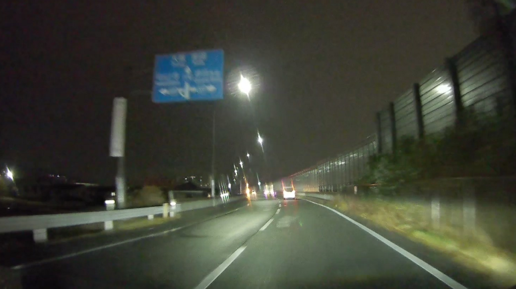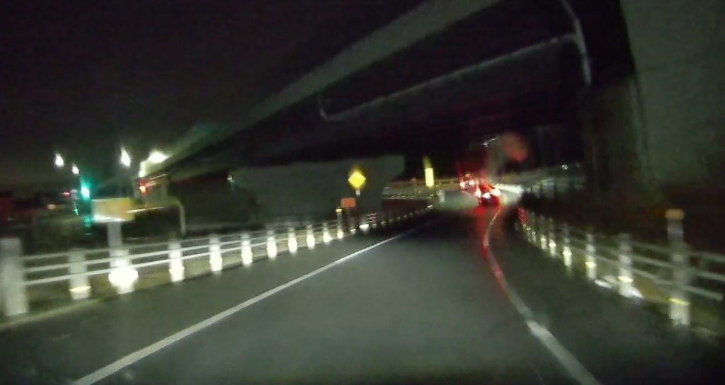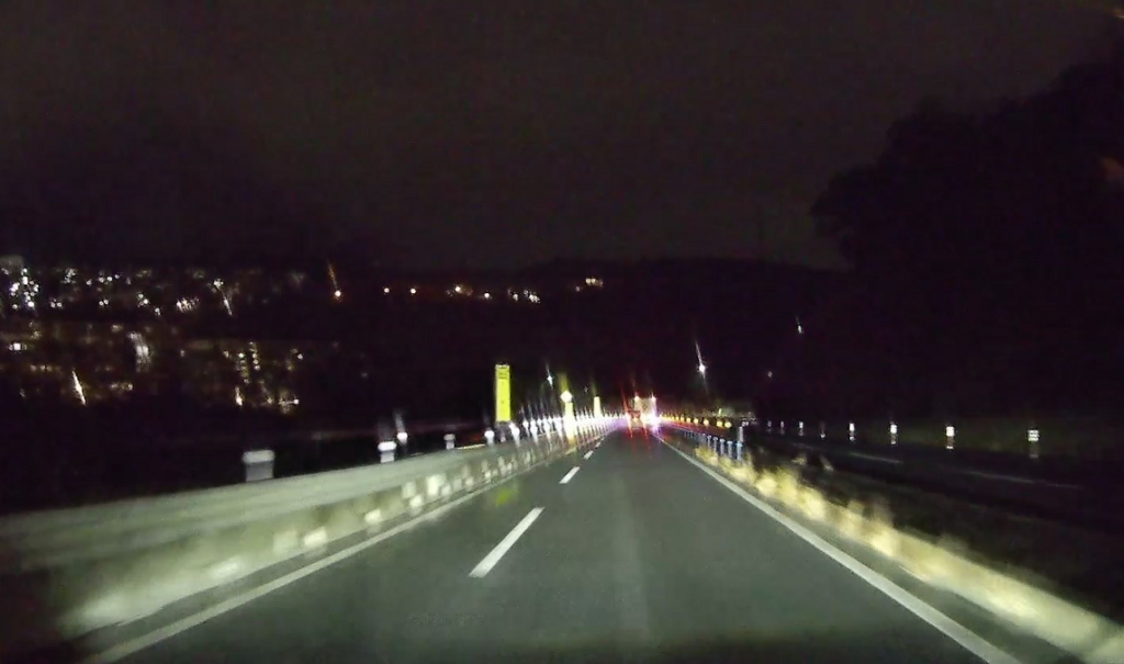 山陽自動車道を潜ります(写真が真っ暗ですみません。夜間はランドマークがほとんどないので高速を潜ったりするのが印象に残ります)。