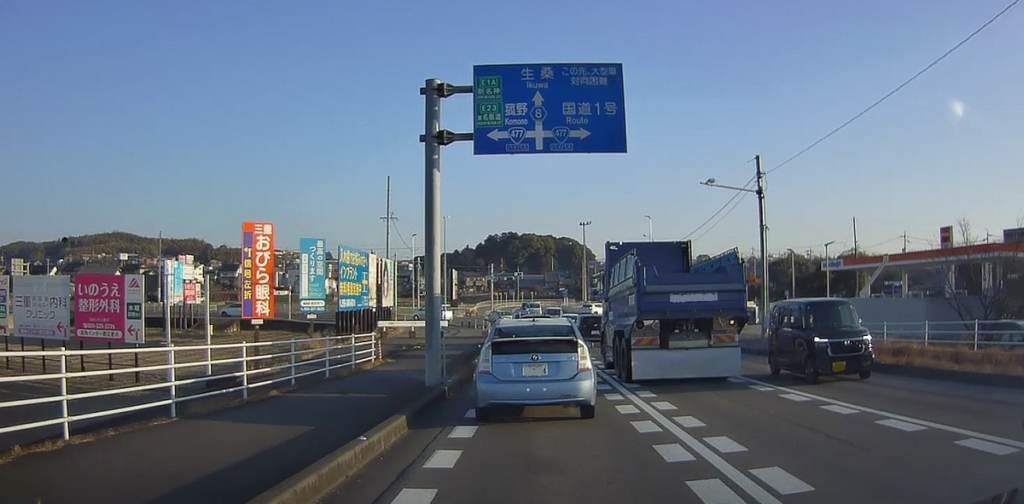 しばらく、走ると北勢バイパスへの入口交差点です。信号交差点ですが、すぐ手前の右折レーンが紛らわしいので気を付けましょう(今回は、右折レーンから本線へ飛び出してきました)。